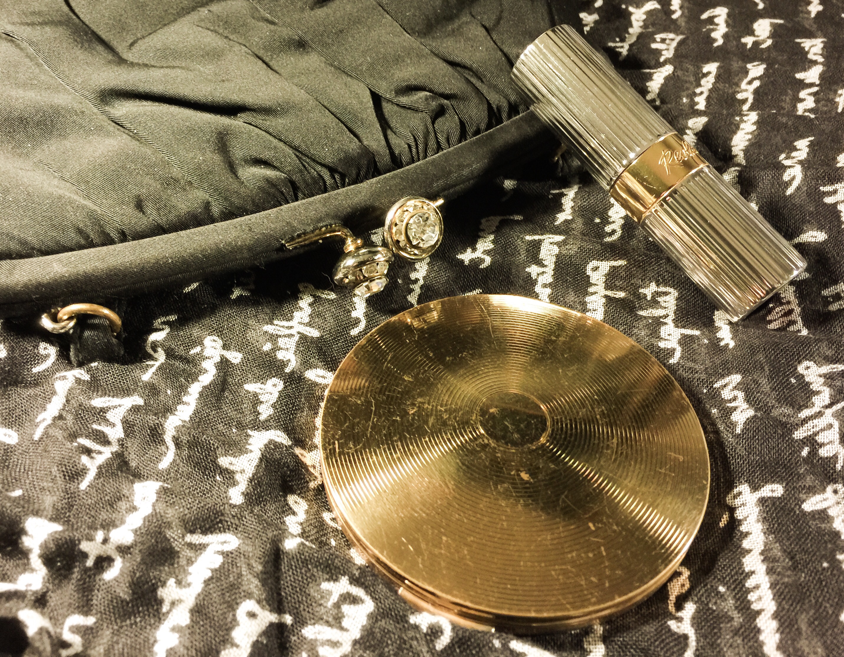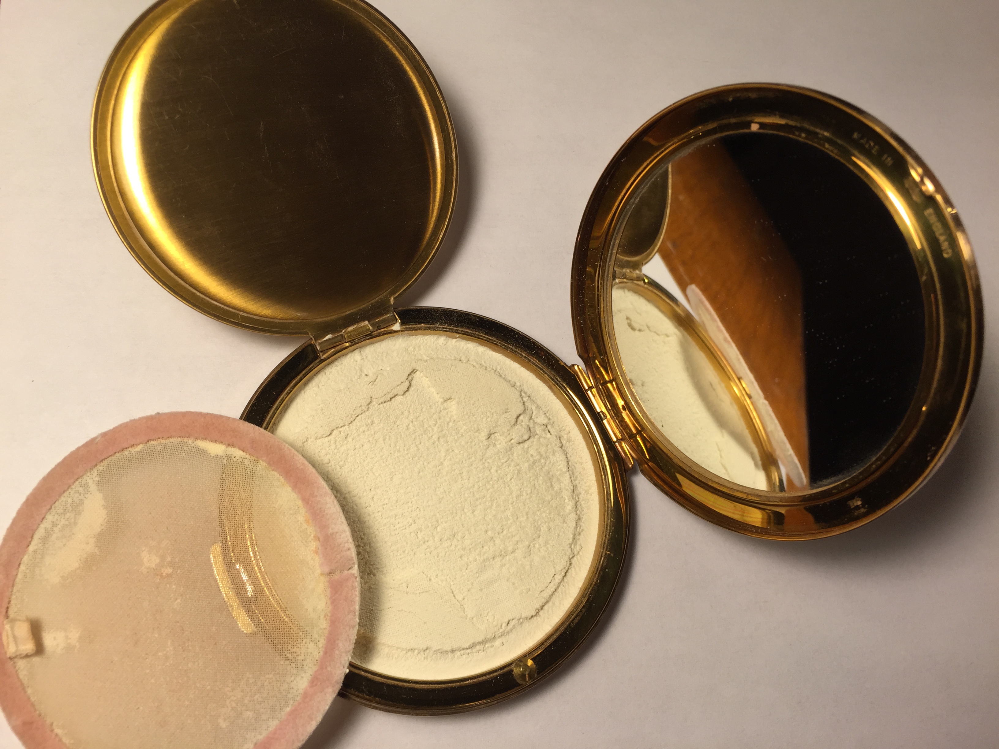 So, being in a bit of a vintage makeup mood lately, I decided to try out a vintage loose powder compact. I decided that to try one out, I would get a very inexpensive one on eBay first, because I wanted to see how they work and if I could stand to use one at all. I got a 50s model Stratton (a UK brand) on eBay. It’s a bit beat up on the outside, but it seals perfectly, the hinges work great, and everything is in perfect working order. It was only $5.00 with free shipping, so I wouldn’t be out much if it was too much of a pain in the ass to use.