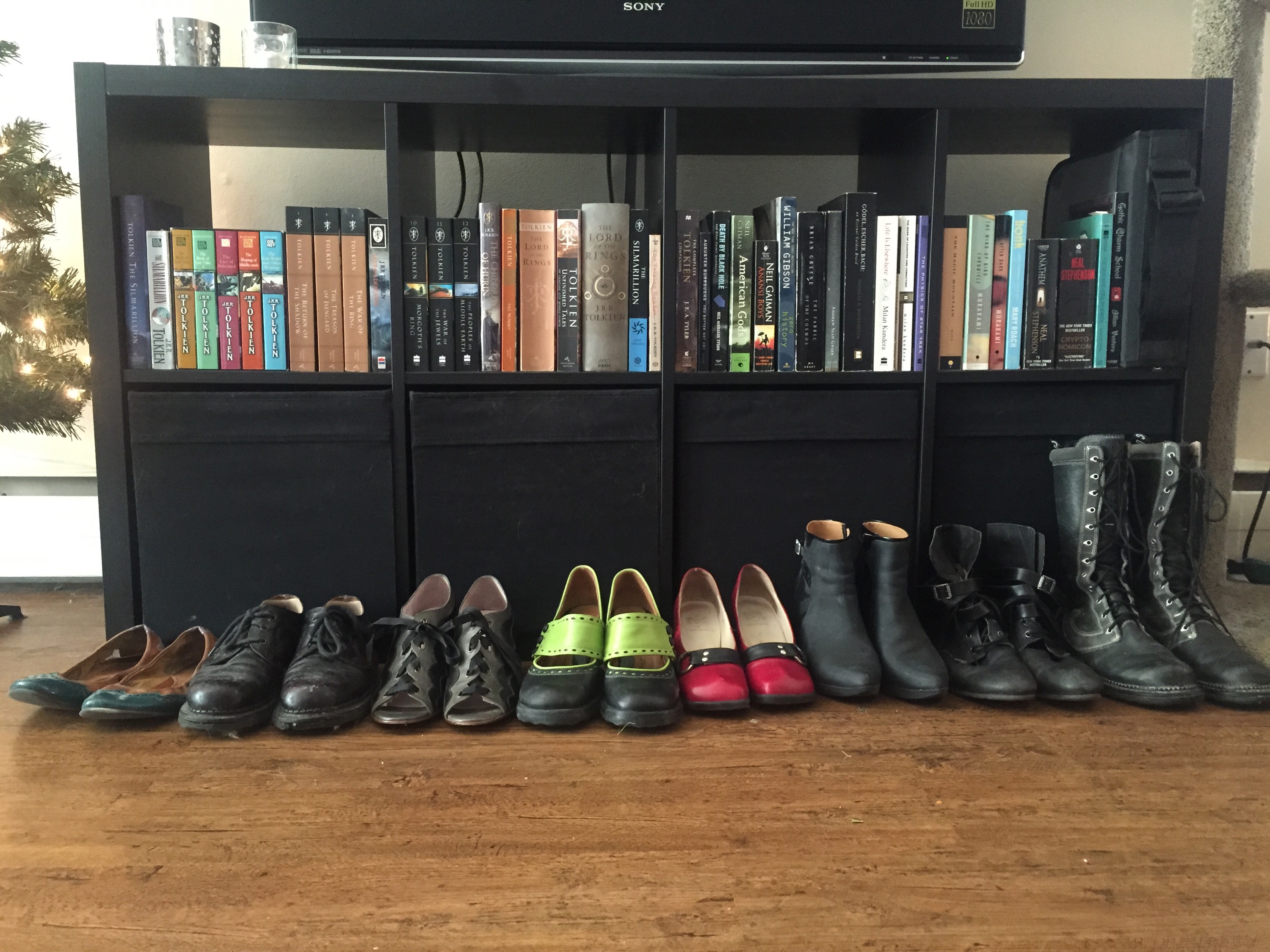 As if I wasn’t enough of a nerd, I store my two favorite collections (my Fluevogs and my amassed J. R. R. Tolkien reference library) in the same place.