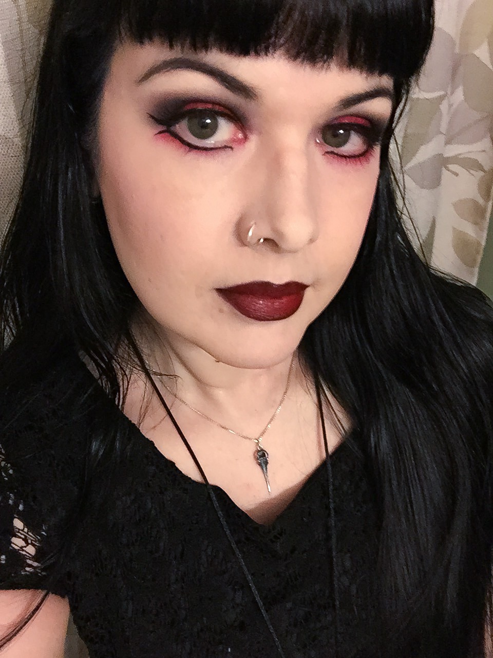 EYES: Bobbi Brown Cream Eyeshadow in Bone as base; MAC Vanilla shadow as highlight; Urban Decay Spectrum Palette shadows in Flashback, Voodoo, and Omen; Sephora Contour Waterproof Eye Pencil in Eccentric Diva; Physicians Formula Eye Booster Liquid Liner Pen in Black; Covergirl Clump Crusher Water Resistant in Black; NYX Micro Brow Pencil in Black