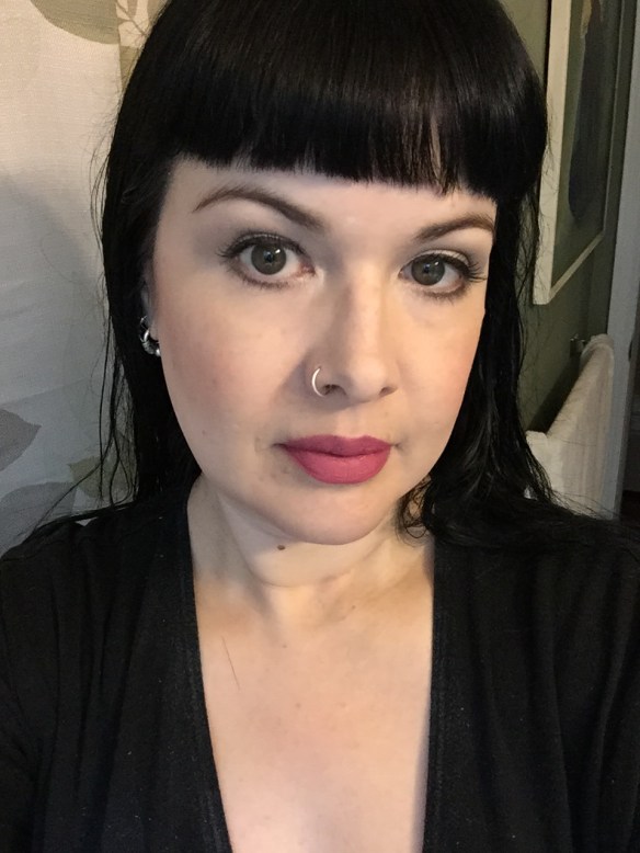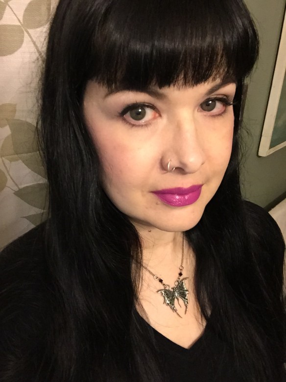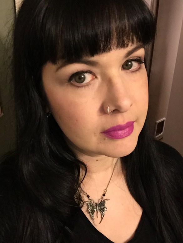 All in all, I have to say that while NYX can be a hit or miss brand for me, I love everything I got in this order.  (I am also wearing the Photo Loving Primer underneath my foundation today – a long time favorite!)  I am wearing the concealer, blush for contour, and black pigment here.  I like that the contour is subtle, but I can go heavier for an evening look if I want to.  The only thing I haven’t tried yet is the purple lipstick, but the photos I’ve seen online are (wait for it) Wicked.
