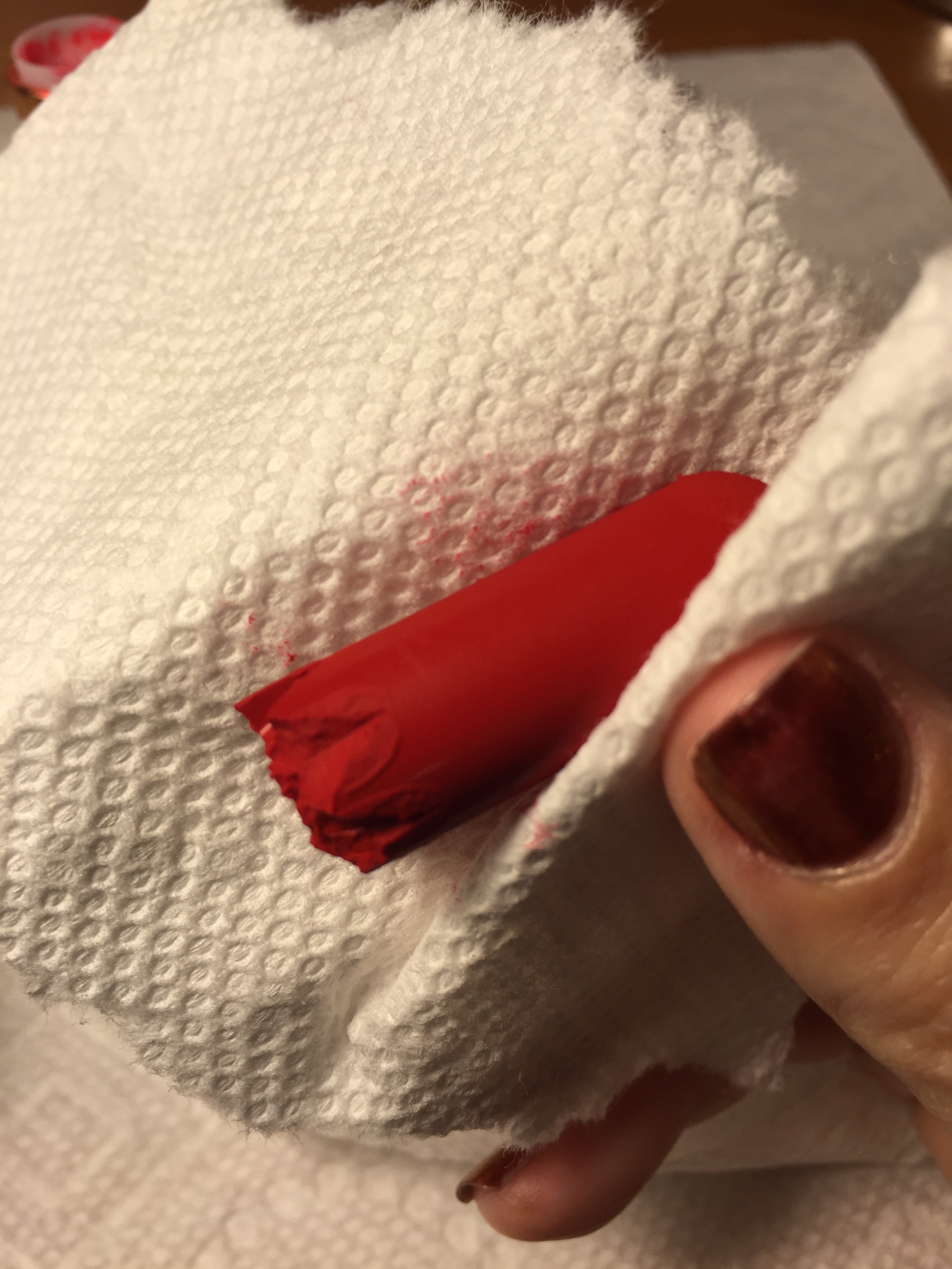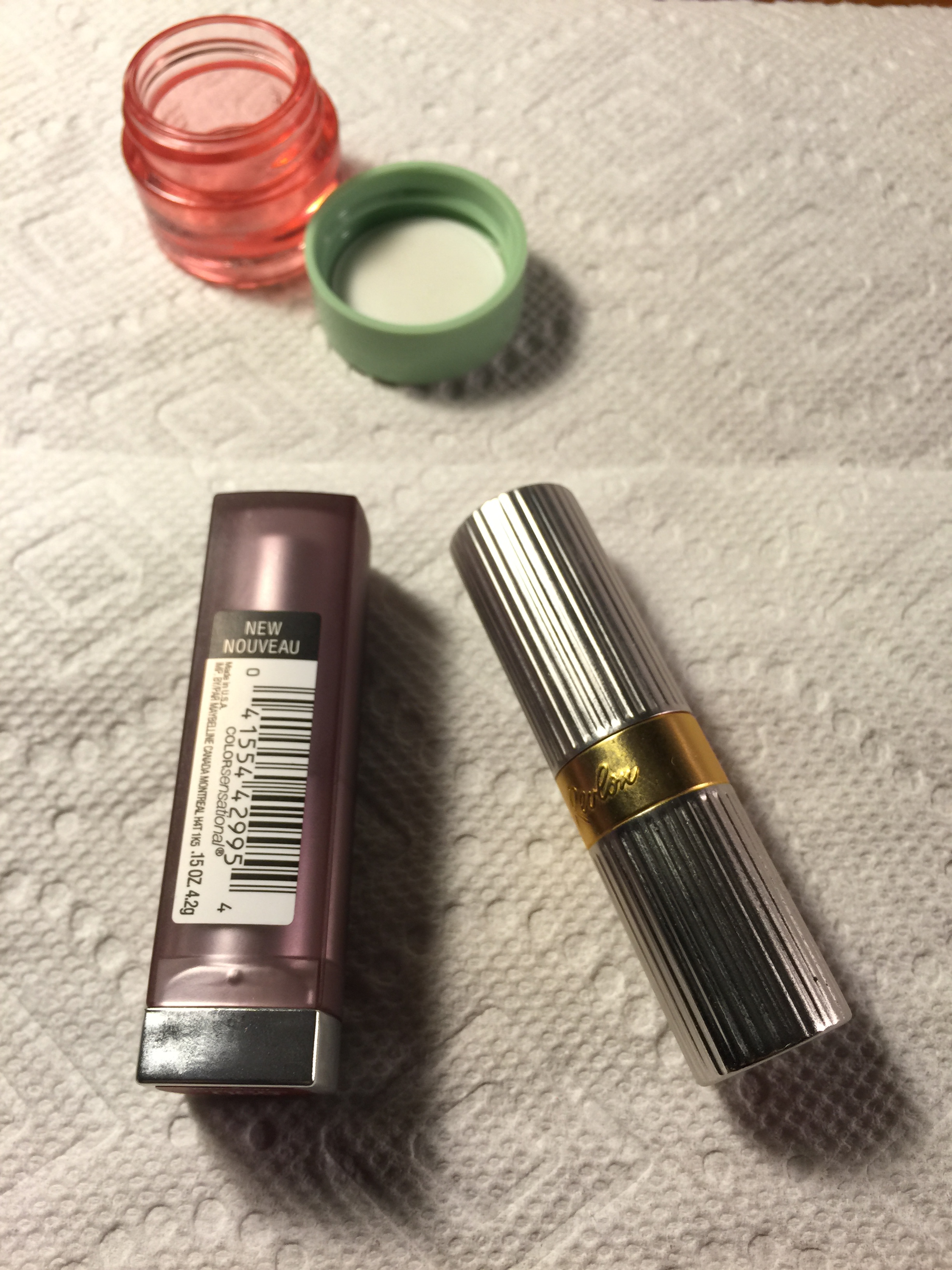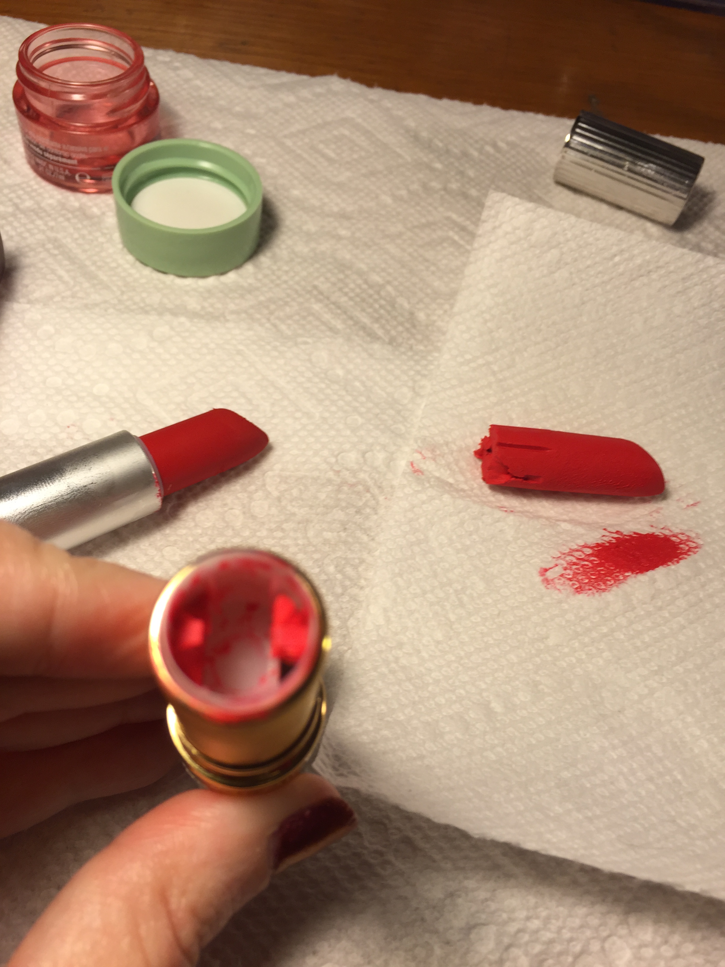 So, last night I put my 2 lipsticks in the freezer and hoped for the best. Today, I put down some paper towels on my desk and got to work! I washed my hands with antibacterial soap and cleaned out a little eye cream jar with alcohol to put the Fire and Ice lipstick in (in case I get crazy and decide to wear it…hey, you never know).