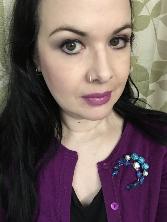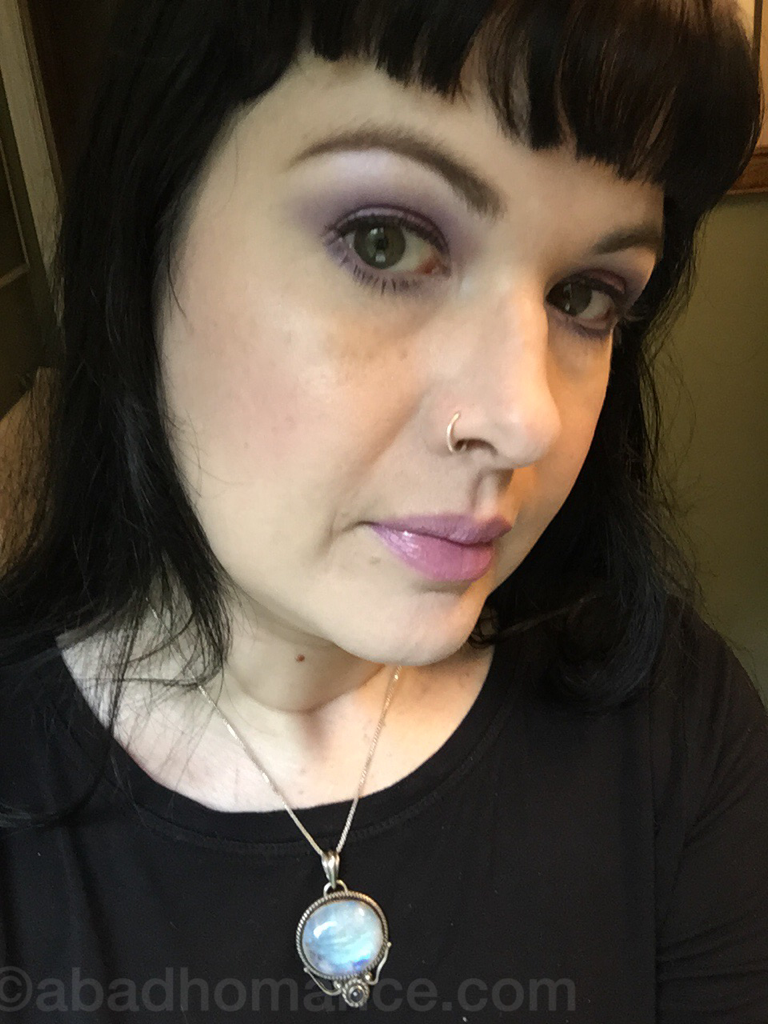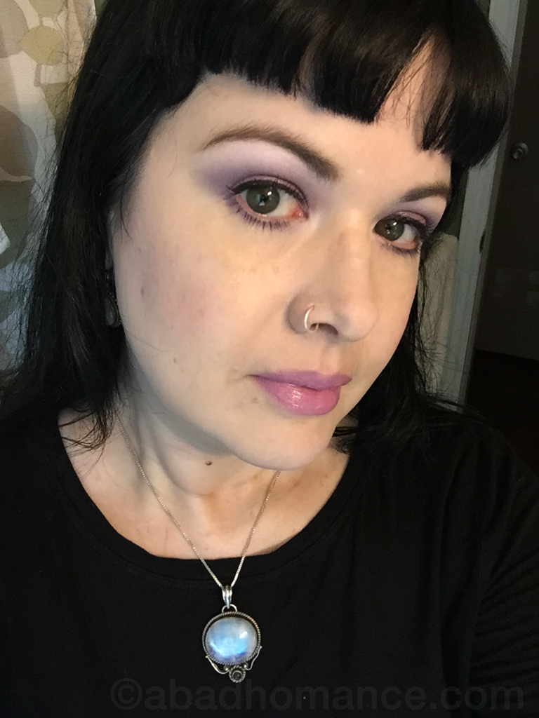 FACE: For the face, I’m still mixing MAC Studio Fix Fluid in NW10 with NYX Foundation Mixer in White. At some point, I’m gonna find that holy grail foundation, but I haven’t yet. I used NARS Radiant Creamy Concealer in Chantilly under the eyes and around the nose and topped off the face with Guerlain Meteorites in Clair so the complexion wouldn’t be too flat. Now the UD comes in – Bittersweet blush is a beautiful purple with fuscia undertones that can be sheered out to where even I can wear it! I topped the cheeks with Urban Decay Aura highlighter, a frosty pink that gives a very impressive glow. I also used this on the bridge of the nose and the Cupid’s bow. Too bad my camera never picks up on that!