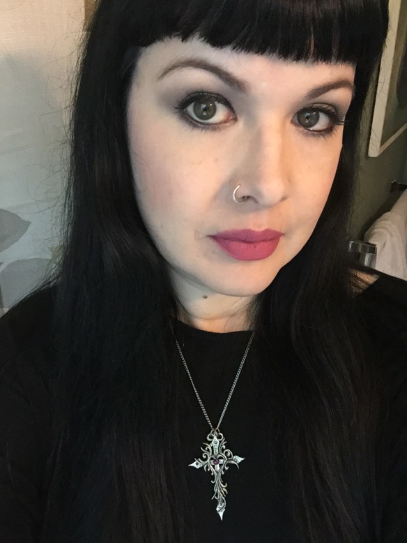 FACE: For the face, I’m still mixing MAC Studio Fix Fluid in NW10 with NYX Foundation Mixer in White. At some point, I’m gonna find that holy grail foundation, but I haven’t yet. I used NARS Radiant Creamy Concealer in Chantilly under the eyes and around the nose and topped off the face with Guerlain Meteorites in Clair so the complexion wouldn’t be too flat. Now the UD comes in – Bittersweet blush is a beautiful purple with fuscia undertones that can be sheered out to where even I can wear it! I topped the cheeks with Urban Decay Aura highlighter, a frosty pink that gives a very impressive glow. I also used this on the bridge of the nose and the Cupid’s bow. Too bad my camera never picks up on that!